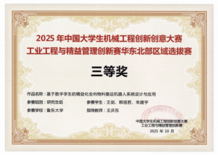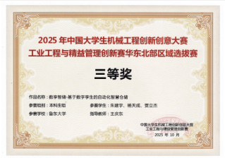 近日,交通学院学生在2025年中国大学生机械工程创新创意大赛工业工程与精益管理创新赛上获得区域赛三等奖2项。