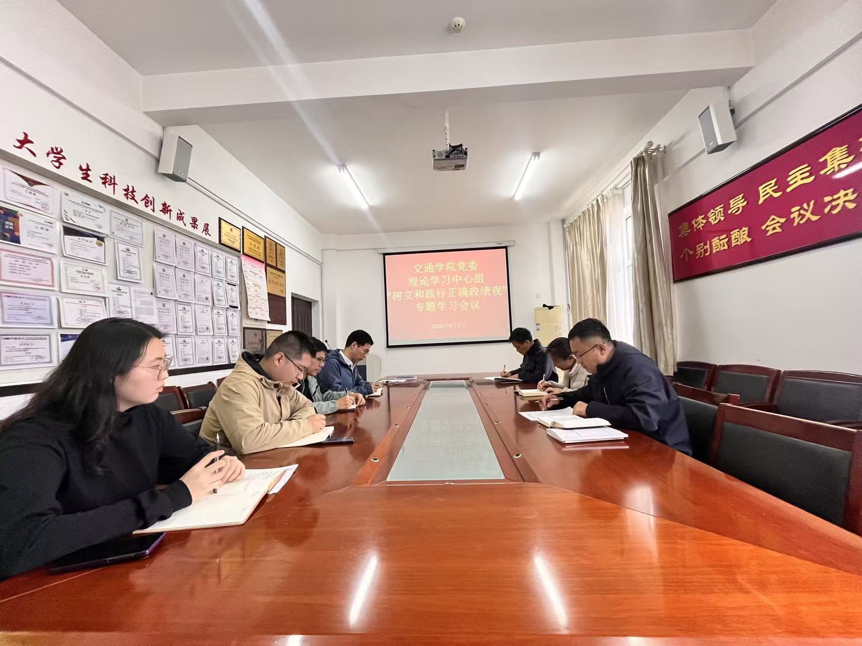2026年4月2日下午,交通学院党委理论学习中心组在北24号办公楼 407会议室召开专题会议,聚焦“树立和践行正确政绩观”这一核心议题开展深入学习。此次学习旨在深入贯彻落实党中央决策部署,引导全院党员干部厘清“为谁创造业绩、创造什么样的业绩、怎样创造业绩”的根本问题,以清醒的政治自觉和务实的工作作风,引领学院各项事业行稳致远。学院党委副书记王强主持学习并作总结讲话,中心组成员全员参加。