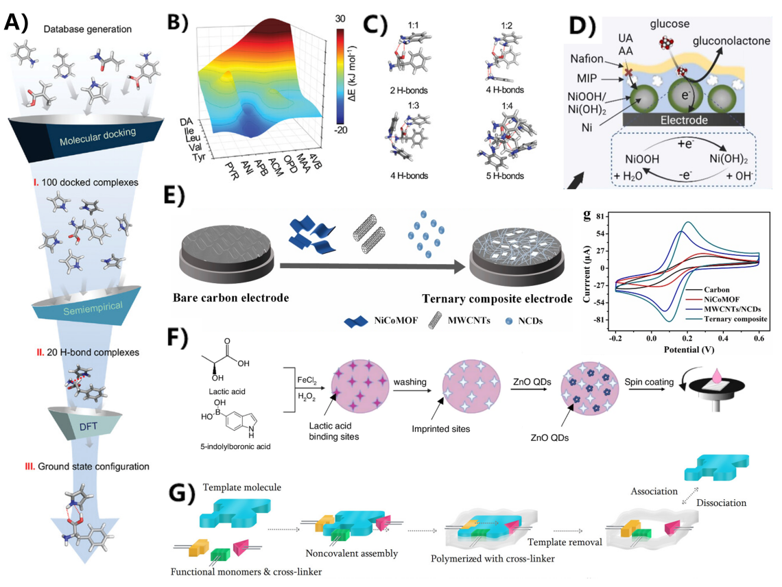 4:(AQuantumDock 计算模拟流程示意图。(BDFT 计算得出的不同功能单体与模板分子相互作用的结合能三维景观图。(C)模拟不同单体与模板摩尔比(1:1 1:4)下的氢键结合构象。(DNi/Ni(OH)₂ 纳米颗粒的电化学催化放大机制。(ENiCo-MOF/MWCNTs/NCDs 三元复合电极的制备流程(左)及不同电极的循环伏安曲线对比(右)。(F)基于 ZnO 量子点(QDs)荧光探针的 MIP 传感器制备示意图。(G)分子印迹选择性纳米孔膜 OECT 传感器结构与传感机理。(撰稿:陈雪叶  审核:刘长霞)
