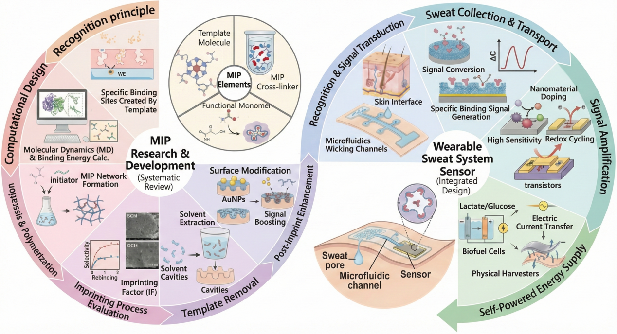 该文章立足于系统性设计思维,全面梳理了分子印迹聚合物在柔性可穿戴汗液传感器中的全流程研究。综述了面向可穿戴汗液传感的技术进展,重点聚焦分子印迹聚合物在汗液传感器中的全流程研究与系统化设计,涵盖分子印迹聚合物原理、合成策略、亲和力增强及模板去除关键流程,贯通从汗液采集输运、分子识别与信号转换、界面材料增强到持续供能的完整传感链条。随着柔性电子、纳米材料、生物传感和数据分析等方面的持续突破,可穿戴分子印迹聚合汗液传感器有望彻底改变疾病管理、预防和预测,促进更健康的生活方式并改变全球医疗实践。