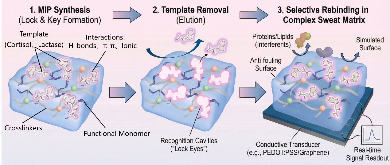 理想的健康管理体系应能实现对个体生理状态的持续追踪,而汗液作为一种易获取且富含多种生物标志物的流体,为非侵入式健康监测提供了巨大潜力。然而,在复杂动态的体表环境中,传统天然酶或抗体等生物识别元件呈现出热力学稳定性差、易受外界环境影响而失活、生产成本高昂等固有短板。为突破这一瓶颈,分子印迹聚合物(MIP)作为一种人工抗体,展现出了极大的应用前景。MIP能够提供高度稳定、选择性和可定制的印迹空腔,不仅完美适配汗液高盐度、pH波动的真实环境,更有望彻底克服传统生物识别元件在复杂基质中的应用局限。